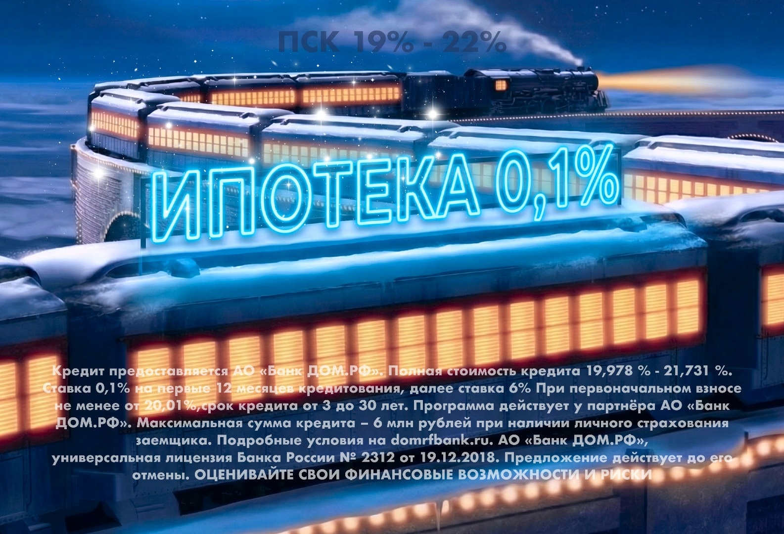 Кредит предоставляется АО «Банк ДОМ.РФ». Полная стоимость кредита 19,978 % - 21,731 %. Ставка 0,1% на первые 12 месяцев кредитования, далее ставка 6% При первоначальном взносе не менее от 20,01%,срок кредита от 3 до 30 лет. Программа действует у партнёра АО «Банк ДОМ.РФ». Максимальная сумма кредита – 6 млн рублей при наличии личного страхования заемщика. Подробные условия на domrfbank.ru. АО «Банк ДОМ.РФ», универсальная лицензия Банка России № 2312 от 19.12.2018. Предложение действует до его отмены. ОЦЕНИВАЙТЕ СВОИ ФИНАНСОВЫЕ ВОЗМОЖНОСТИ И РИСКИ